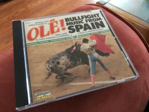My husband got a package in the mail. He actually gets a lot of packages…very small quick drying towels, tiny cork screws, chewable tablets of toothpaste, you know…stuff to take on the Camino. So I didn’t think anything about this one. It’s probably one more thing that I had no idea existed. Well I know you’re just dying to know what was in it so I won’t keep you in suspense any longer. He ordered a bunch of CDs of Spanish music. No kidding it was all Spanish music! And the one on top really caught my eye. It was Bullfight Music From Spain.