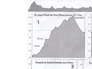 Yesterday was my first day walking. I did the upward climb from st. Jean Pied de Port. I don’t know the exact elevation but you can see from this map it’s nearly straight up. Only 5 miles but very hard especially when one has not trained.