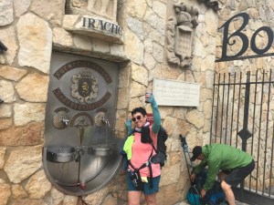 We got about a quarter of a mile away from the hotel when I realized I had left my trekking poles in the lobby. I encouraged Glen to go on. He said he’d walk slowly so I could catch up easily. Well I retrieved my sticks and started back, but I stopped to take some pictures and there were less yellow arrows to indicate the way of the camino and it started to rain harder. Still I thought I can walk in this as long as my feet stay relatively dry. You clever fellow pilgrims, you already know I then stepped in a puddle up to my ankles. Now it’s really pouring and every step is squish-squish-squish-squish…. Still I thought this can’t last all day like this I can still walk to Los Arcos. I finally arrive at a little town called Irrachi. There’s a monastery here with a famous fountain with 2 spigots. One with wine and one with water, all for the Pilgrims.