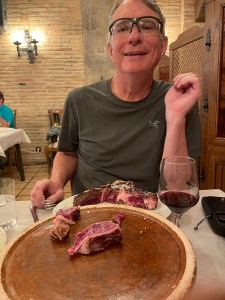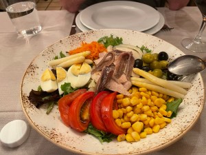 The third blessing came at lunchtime in Viana. On the camino it’s easy to lose track of the days. Today is Sunday and the streets are full of families congregating after church for a drink and a meals. Kids are playing soccer and babies are in strollers. We finally found a restaurant with tables inside. We looked like pilgrims, a bit dirty and sweaty, certainly not dressed in our finest attire. The waiter took no note and seated us. No menu in English and we couldn’t decipher the Spanish menu. Being adventurous people Glen pointed to the menu and our waiter said, “Si?” And Glen said “Si.” This is what he got.