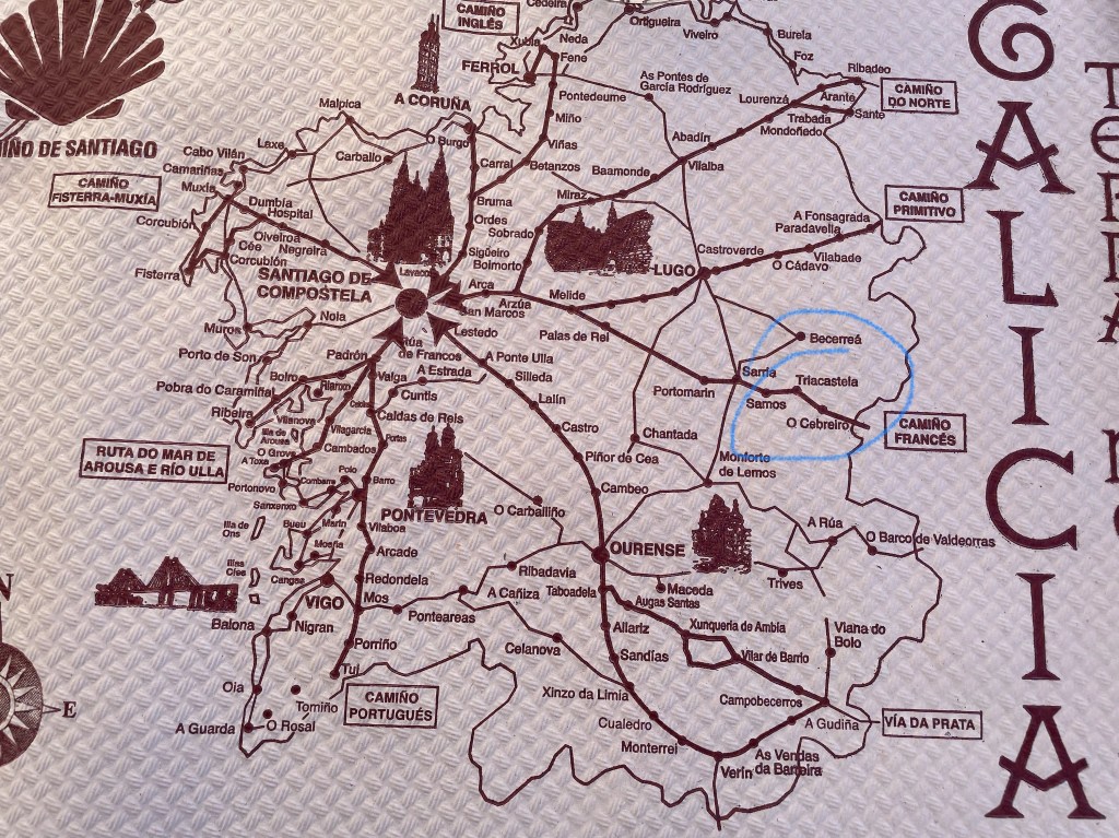 So you can see by the elevation map that today has a major downhill. Well after yesterday…we decided to skip it and take a taxi to Triacastela 😮😁😉. Yup it’s an easy day today 🥳 It’s a nice little town and we have finally crossed over from Castilla & Leon into Galicia.