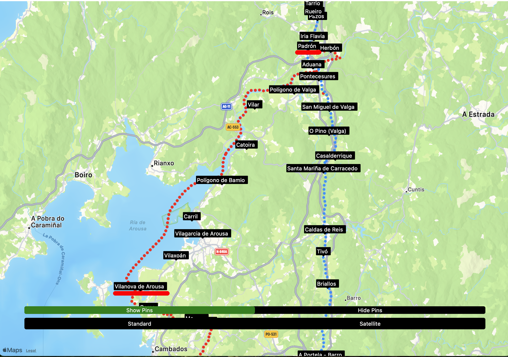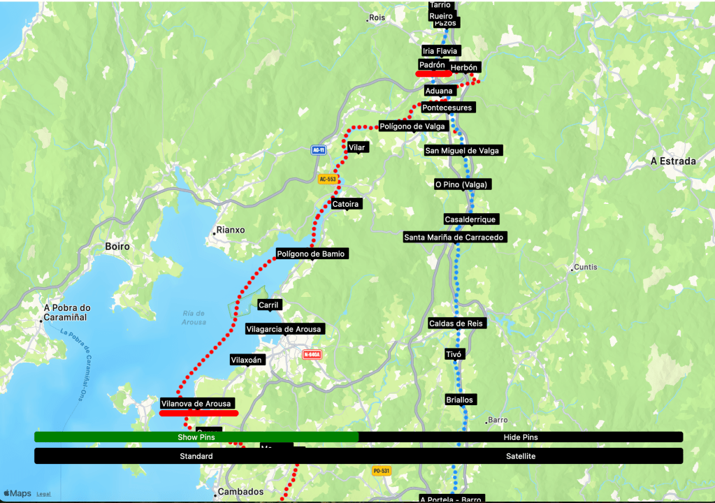 This is the water route that the boat carrying the body of St. James took to reach Galicia, Spain. His disciples then carried his body to be buried on the site where the alter in the Cathedral of Santiago is located.